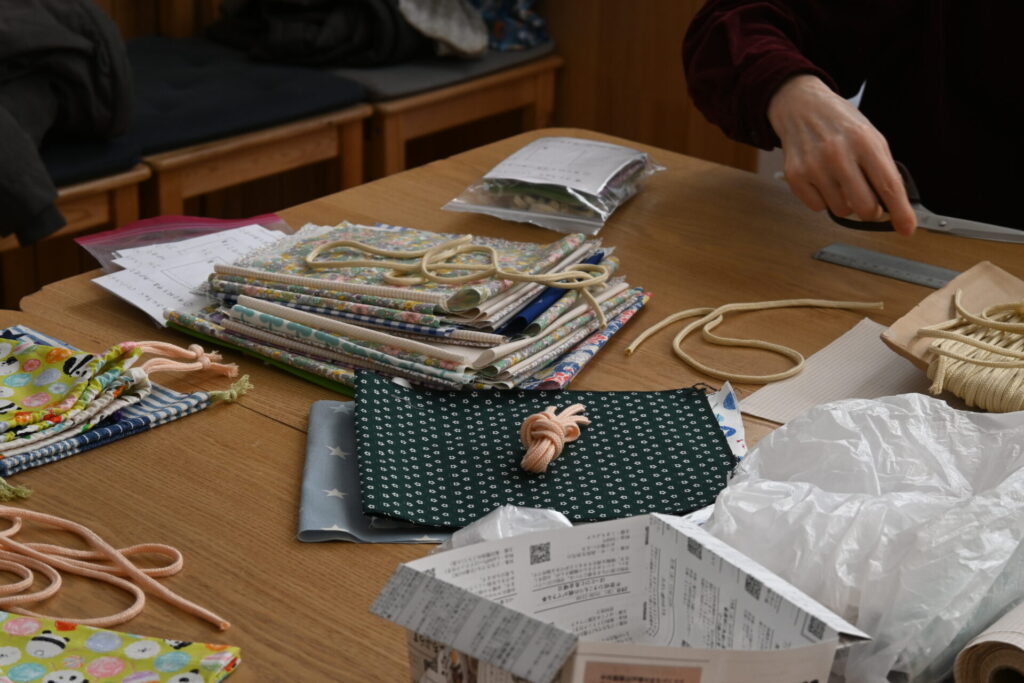 今回はひもを通して巾着を完成したり、布とひもをくみあわせてキットをつくる作業をしました。